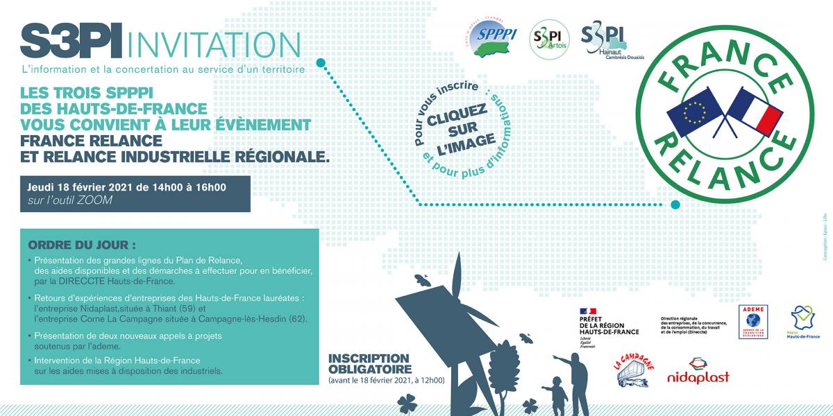 Ce webinaire organisé en partenariat avec les deux autres S3PI de la région (S3PI Artois et Côte d'Opale Flandres), centré sur le plan de relance fut l'occasion pour la Région, la DIRECCTE et l'ADEME de présenter leurs dispositifs d'aides, ainsi que d'écouter les retours d'expériences des entreprises NIDAPLAST et CORNE LA CAMPAGNE et de découvrir leurs projets soutenus par le plan.